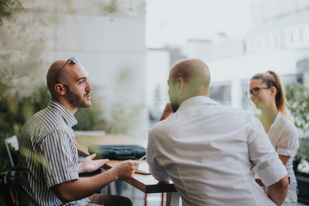 Young entrepreneurs strategizing and collaborating on project outdoors for growth
