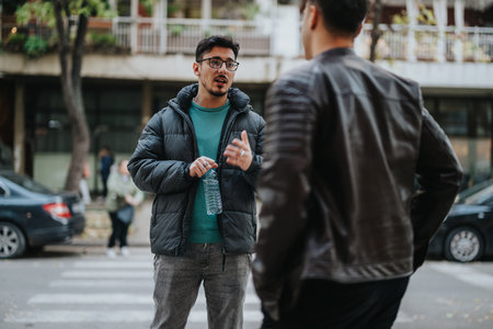 Two men are engaged in an animated conversation, their gestures and expressions conveying enthusiasm. They appear to be discussing a matter of mutual interest, creating a sense of connection and
