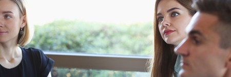 Two girls and a guy are talking in sign language. Three deaf students chatting in a university classroom.