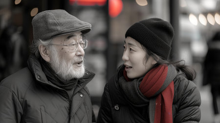 Two adults in winter attire deeply engaged in conversation on a city sidewalk, surrounded by warm evening lights