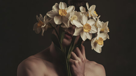 A person conceals their face with a bouquet of daffodils creating a striking contrast against a dark background.