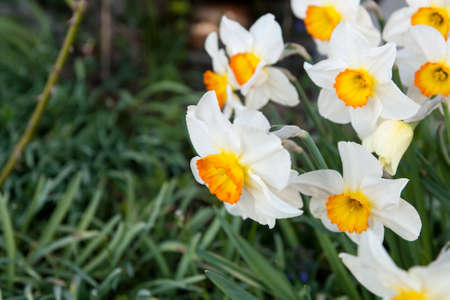 Close up of daffodils. Variety of white flowers with orange center. There is space for your text on the left. Usable as wallpaper, background, postcard, banner or poster and much more.