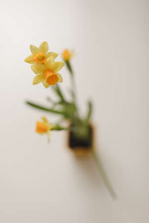 Spring bouquet of aromatic narcissus flowers on light grey