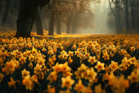 A field vibrant with yellow daffodils, trees standing tall in the background, A majestic field of golden daffodils in full bloom