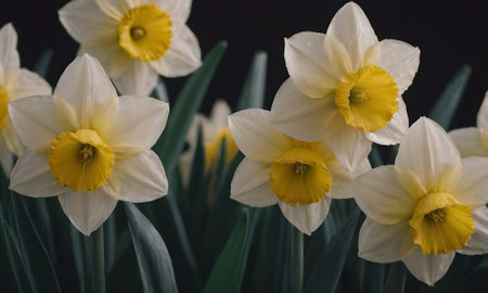 A beautiful capture of bright yellow daffodils in full bloom, surrounded by lush greenery. This image evokes the refreshing essence of spring and nature's beauty.