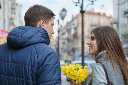 Couple in love in city. Young happy man and woman in spring city talking, walking, with bouquet of yellow flowers daffodils.