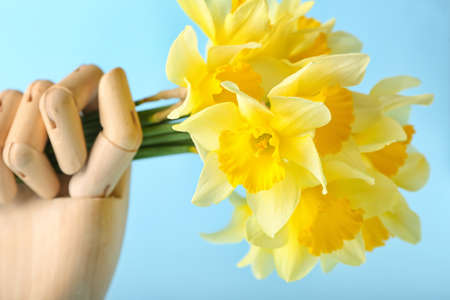Wooden hand with beautiful daffodils on color background