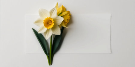 Daffodil flower on a yellow background, place for text. flat lay.