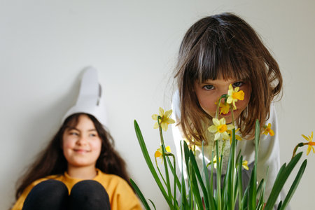 small girl watching behind daffodils and bigger girl sitting with easter bunny ears on the head