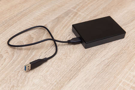 External hard drive with cable on a wooden table
