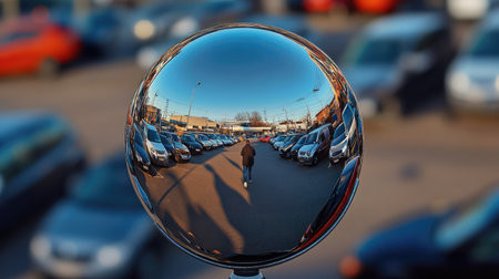 A spherical road mirror in a parking lot, reflecting rows of parked cars and a pedestrian walking