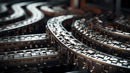 A close-up view of a conveyor belt system in a modern factory during daytime showcasing its intricate design and functionality