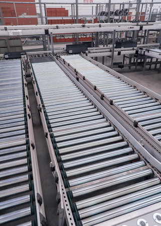 This image showcases a modern industrial conveyor system featuring a series of rollers, designed for efficient material transport and workflow optimization in a warehouse environment.