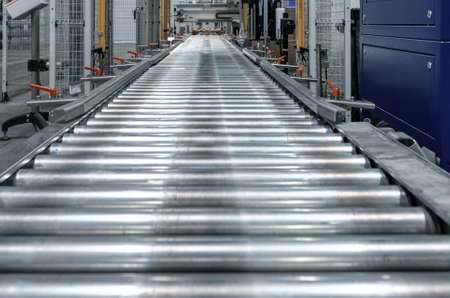Warehouse conveyor belt. Close-up of an automated conveyor system in a large logistics warehouse. Background is blurred.