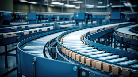 Modern Automated Conveyor Belt System in Industrial Warehouse with Blurred Background