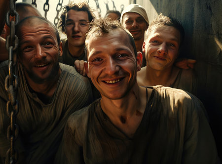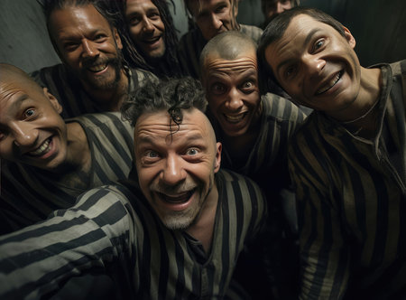 Jailers take selfies with prisoners. Medium shot
