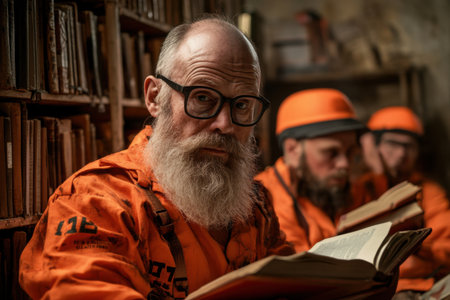 A group of prisoners in bright orange uniforms is gathered in a library flipping through books while some whisper to each other. The atmosphere is one of reflection and concentration.