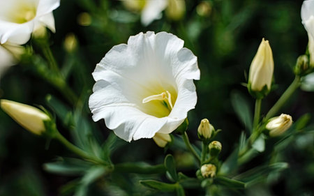 Blooming white flower of a field bell. Meadow. Petal plants. Leaf of a plant. Background image. Place for text.