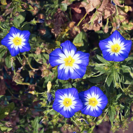 Blue flower morning glory or bindweed on the lawn in the flower garden. Convolvulus Tricolor