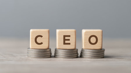 This image showcases wooden blocks arranged to spell CEO, positioned atop coin stacks, representing the connection between leadership and financial success in business.