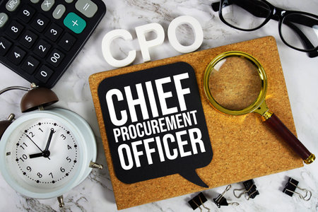 CPO Chief Procurement Officer text with Calculator, alarm clock and magnifying glass on marble background