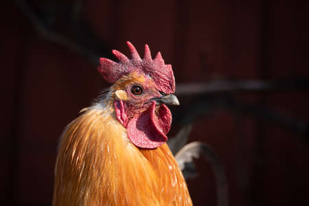 close up of a breed rooster in the yard, portrait of a farm rooster in the yard