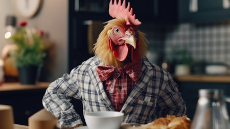 A surreal portrait of a stylish rooster in a shirt with a bow tie.