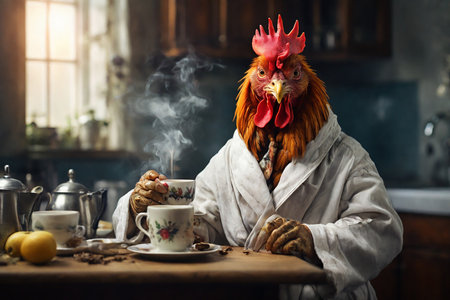 A chicken dressed as a chef stands confidently, wearing a white chef hat and coat. The bright red background adds a fun and lively touch to this quirky culinary scene.