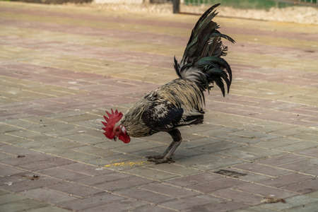 The Republic of Crimea. the city of Belogorsk. July 17, 2021. A rooster pecks grain in the Taigan Lion Park.