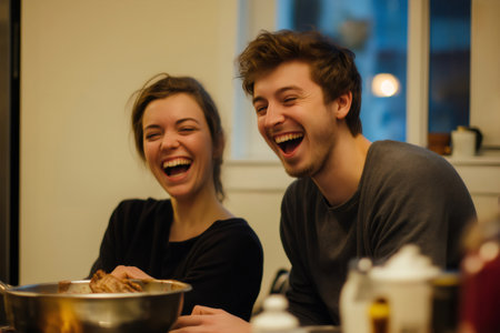Young couple laughing while preparing a meal together in a modern kitchen, enjoying their time together