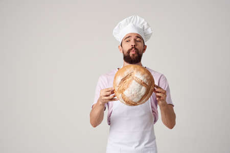 male chef in a white apron with a cap on his head with a spoon in his hands preparing food