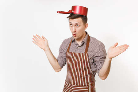 Young fun crazy man chef or waiter in striped brown apron, shirt holding red empty stewpan on head isolated on white background. Male housekeeper or houseworker. Kitchenware and cuisine concept