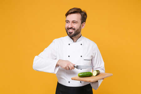 Smiling young bearded male chef cook or baker man in white uniform shirt posing isolated on yellow wall background. Cooking food concept. Mock up copy space. Holding knife cutting board with cucumber.