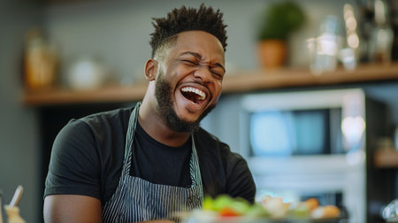 A man with a beard is laughing while eating food. He is wearing a black shirt and apron