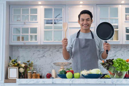 Happy Young man in apron with vegetable holding the pan and wooden spoon in the kitchen. Vegetarian, health, diet, vitamin. Food, cooking, cuisine, menu, dishes, recipes.