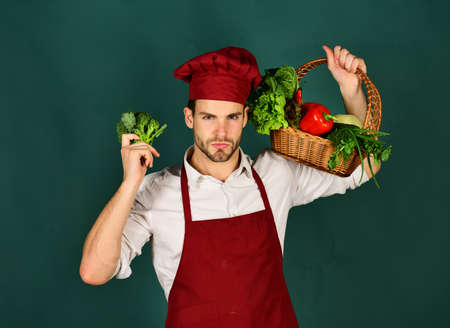 Pick fresh vegetables. Chef cooking vegetarian recipe. Man chef wear apron cooking kitchen. Man cook vegetarian recipe with fresh vegetables. Vegetables main ingredient. Recipe with fresh vegetables