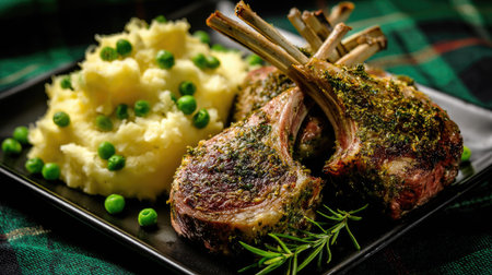 This image features a beautifully plated meal, showcasing a rack of lamb alongside mashed potatoes and peas. The composition highlights the textures and colors of the food, from the roasted lamb to the vibrant green peas. The presentation suggests a culinary theme suitable for food-related projects or advertising purposes.