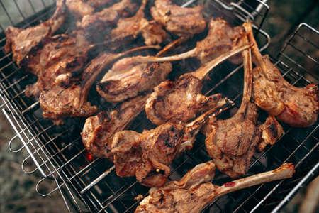 Grilled lamb ribs on grill. Hot rack of lamb with grilled vegetables, Culinary, cooking, bakery concept,
