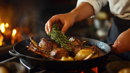 A skilled chef prepares a gourmet meal by adding fresh herbs to sizzling meat in a rustic kitchen, creating a delicious aroma and inviting ambiance.