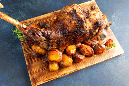 Cooked leg of lamb and new potatoes. On a gray background. selective focus.