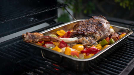 Chef cooking a delicious leg of lamb on a barbecue with colors peppers and potatoes in a metal tray. Closeup of tasty goat meat in BBQ of garden home at holiday vacations. Roast grill food in Spain.