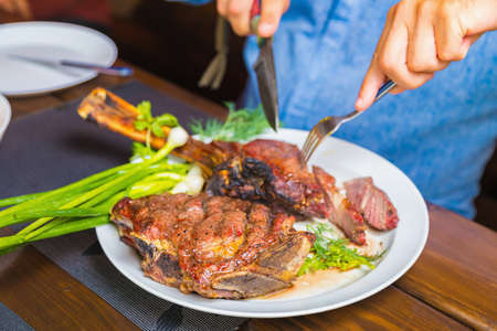 A man cuts cooked fried meat in a plate. Oven-roasted meat for dinner.