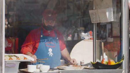 Turkey, Istanbul-December, 2020: Man roasts street food. Action. Cook cooks grilled fish in street shop. Cooking street food in shops in sunny weather. Man prepares food behind the window of street stall.