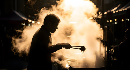 A street food vendor is silhouetted against a dramatic cloud of backlit steam as he cooks at a night market. Using tongs to prepare food, the atmospheric scene captures the essence of street food culture, with the warm, glowing steam highlighting the action.