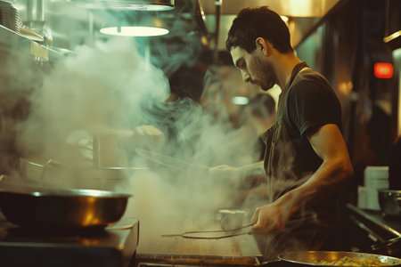 Culinary delights chef prepares street food urban food festival vibrant night market close-up view flavorful experience
