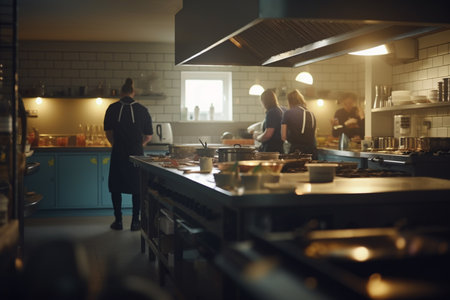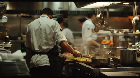 Professional chefs working in a fast paced restaurant kitchen, preparing various dishes under warm toned lamps