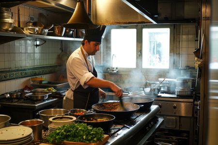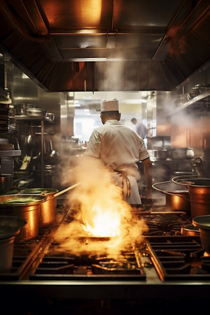 A chef preparing food in a restaurant kitchen, AI