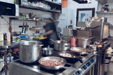 Kitchen staff busy with preparing food during lunch time in the restaurant