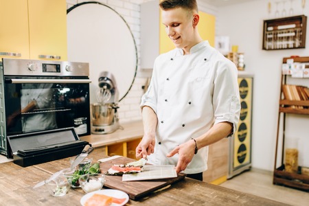 Male cook making sushi, asian kitchen