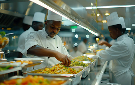 Men and women preparing fresh gourmet meals in commercial kitchens generated by artificial intelligence